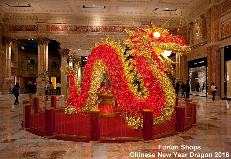 Celebrating Chinese New Year, The Forum Shops at Caesars is once again sharing the fabled creature by displaying a 22-foot long, six-foot wide and 12-foot high dragon on the Fortuna Terrace near the mall entrance from Caesars Palace casino. The massive 950-lb steel-framed dragon is covered in 30,000 red and amber LED lights with many flickering and sitting on a red carpet surrounded by hand-painted wood pillars, gold fencing and red velvet ropes. While the Chinese New Year begins on Feb. 8, the Chinese dragon will be on display throughout the celebratory season.