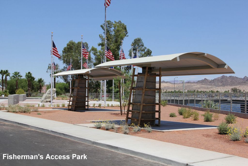 Another outdoor area is Fisherman's Access Park located on the river north of the Riverside Resort and across Casino Drive from the bridge trailhead. This is not part of the original trail system design but through a joint public-private arrangement with Don Laughlin, owner of the Riverside Resort, the park was developed. This park has a newly constructed launch ramp; a public-use dock; picnic ramadas; a Flag Plaza maintained in conjunction with the Laughlin American Legion; additional parking spaces for vehicles with boat trailers; and bank fishing access to the Colorado River.