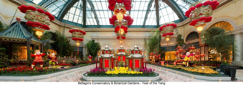 The Bellagio's Conservatory & Botanical Gardens is celebrating Chinese New Year with a captivating display commemorating the Year of the Yang through March 15. The display features 22,000 red and gold flowers, silk-lantern chandeliers and Asian vignettes incorporating elements of Chinese design. The celebration is the Year of the Yang, which simultaneously honors the Goat, Sheep and Ram. The Goat is recognized with a 14-foot-tall grassy mountain and five animated goats while the Ram is honored elsewhere around the resort. An Asian home with jade doorknobs is built in the mountainside while nearby water cascades into a pond surrounded by citrus trees.