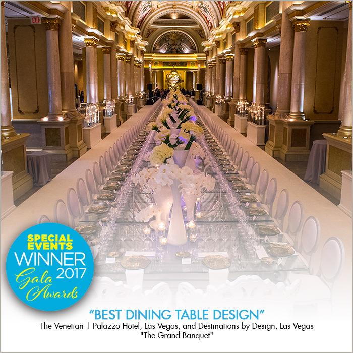 Local event company, Destinations by Design, Inc. (DBD) won “Best Dining Table Design” for “The Grand Banquet,” along with The Venetian | Palazzo, at the 32nd annual Gala Awards competition during The Special Event held in Long Beach, Calif. For the third year of Ultimo: A Weekend of Excellence, the four-day event celebrated the romance of Italy with lavish feasts and featured The Grand Banquet, a creative collaboration between several of the world's best chefs. DBD's award-winning design was set for 120 guests with a “Dinner in the Clouds,” theme. A 120-foot-long glass table displayed beautiful white accent pieces and featured hanging chandeliers underneath the table. Using custom effects, artificial clouds were blown into the space throughout the night.