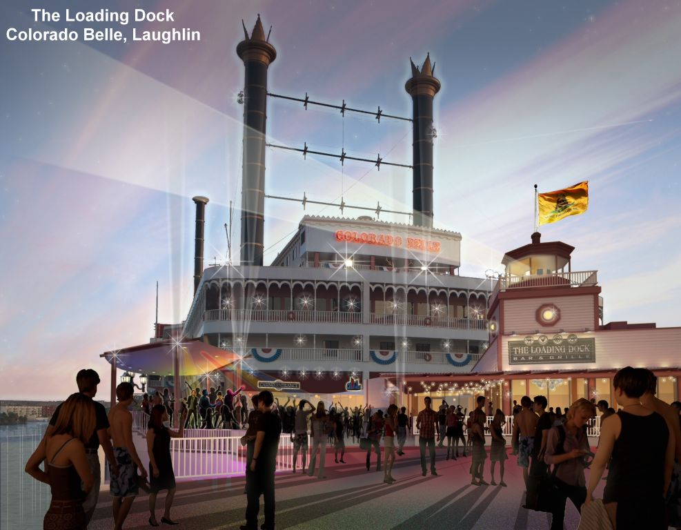 Finishing construction, the Colorado Belle has opened its new restaurant The Loading Dock and Grille featuring Southwestern Cuisine. The 250-seat eatery occupies the “bow” of the “boat” and offers both indoor and outdoor patio seating for 92 guests. The Loading Dock features free live entertainment, two bars, and an open fire grill. It opens daily at 7 a.m.