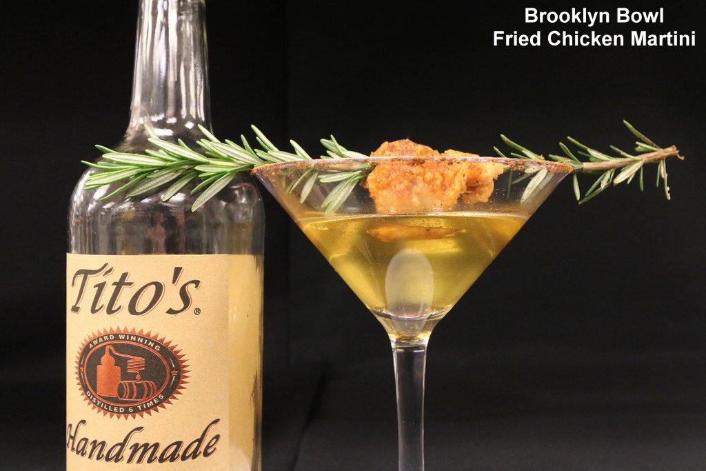 Brooklyn Bowl to celebrate its one-year anniversary in Las Vegas at The LINQ has debuted the Fried Chicken Martini for a limited time. The unusual cocktail is a nod to the venue's famous fried chicken. Tito's Handmade Vodka is infused with a batch of fried chicken for two weeks. Then the honeyed rim drink is dipped in the restaurant's signature fried chicken seasoning and garnished with a boneless piece of fried chicken skewered with a sprig of rosemary.
