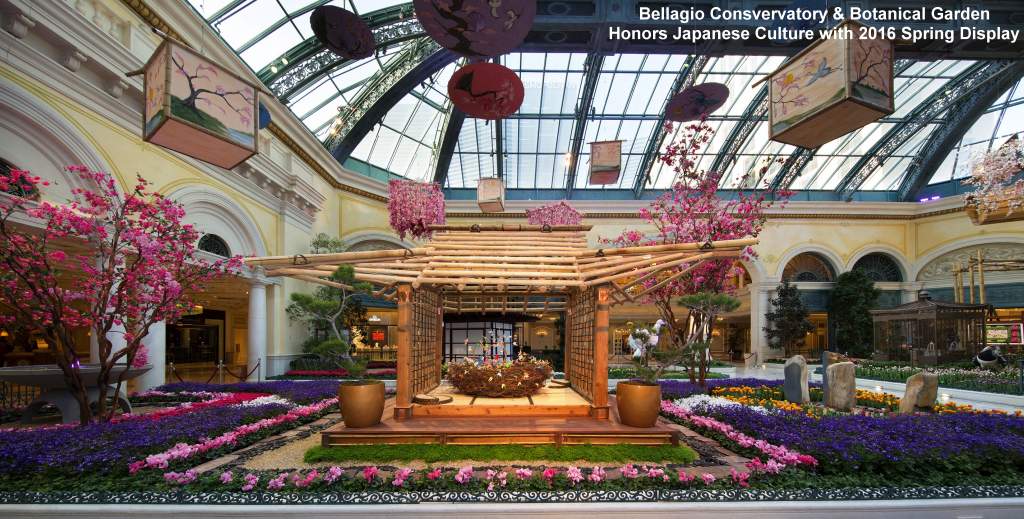 The new display at the Bellagio Conservatory & Botanical Gardens continuing through May 14 features blooming cherry blossoms, peaceful waterfalls and traditional Japanese architecture. Focal points exhibited among a total of 82,830 flowers include: