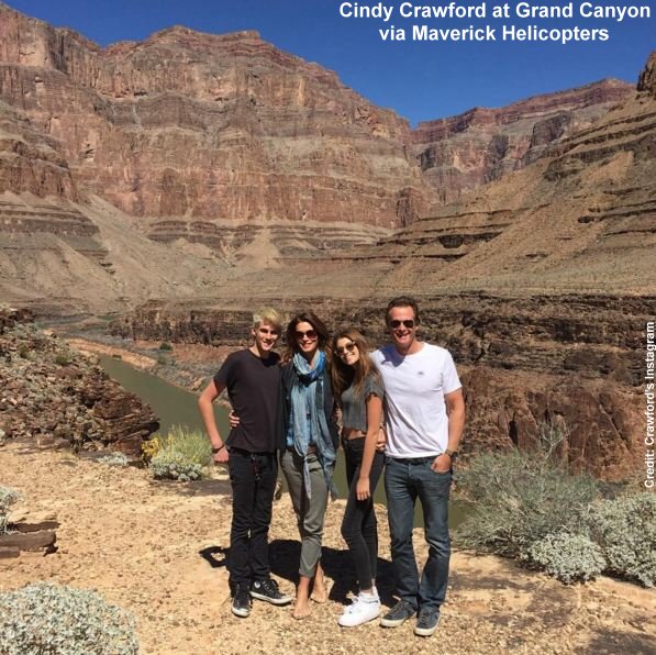 Supermodel Cindy Crawford recently enjoyed a picture-perfect day at the Grand Canyon with her husband Rande Gerber, son Presley and daughter Kaia during Maverick Helicopters’ Wind Dancer excursion.