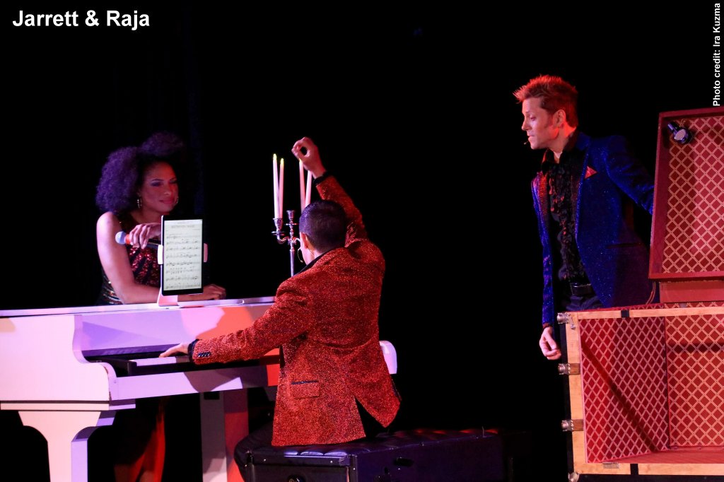 The Juilliard School trained Raja intermittently between non-traditional magic tricks gets to show off his talent with piano numbers including John Lennon's “Imagine,” “Blue Danube” and Beethoven's Fifth Symphony. But then he is the foil for Jarrett being sawed in half or floating above his piano. Filling out the entertaining family-friendly show are powerful singer JR Phelps and dancer Jill LPhenegar.