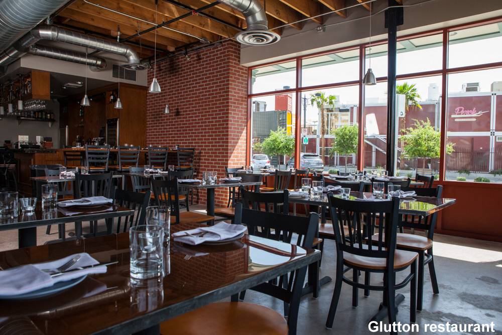 Glutton is housed in a renovated midcentury building and maintains the original oak ceiling from 1955. Stained concrete floors, exposed brick and a solid stone chef's counter combine to create an industrial yet comfortable atmosphere. The restaurant seats approximately 78 patrons indoors and 25 more on an outdoor patio where Manchester will cultivate fresh herbs.