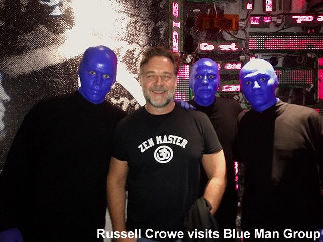 Actor Russell Crowe attended Blue Man Group at the Luxor recently and visited with the trio afterwards.
