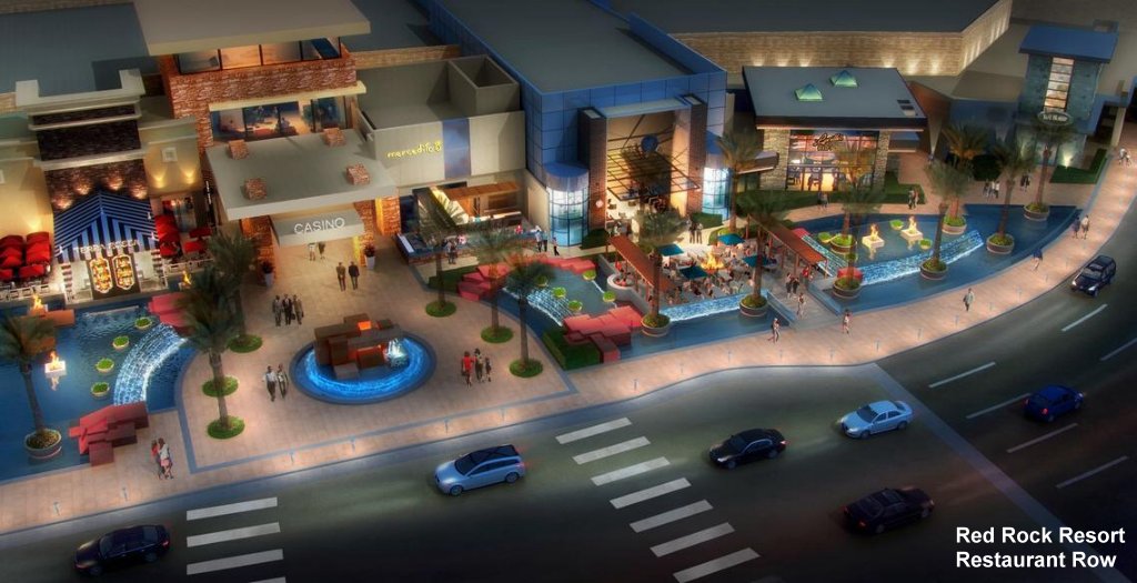 Red Rock Resort designers will create a “restaurant row” along the property's entrance fronting Charleston Boulevard with outdoor entrances and patio seating for four new restaurant concepts. An outdoor pedestrian walkway will link the restaurants, two of which will be outside operators and highlight landscaping and water features.
