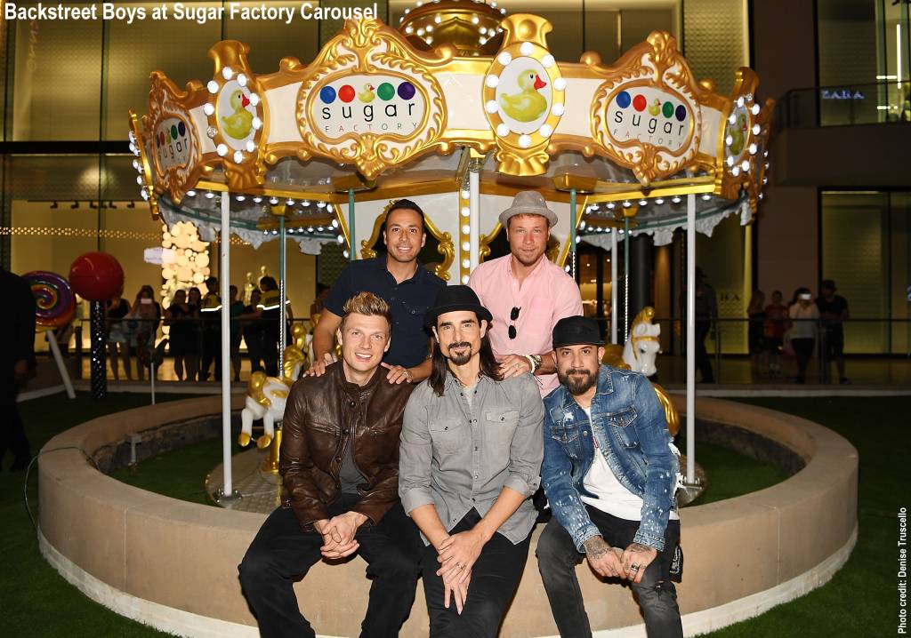 Backstreet Boys, who are celebrating their 24th anniversary, were at the grand opening of Sugar Factory's newest confectionery location in Las Vegas at the Fashion Show mall. The group took a photo in front of the 14-seat horse-drawn carousel.