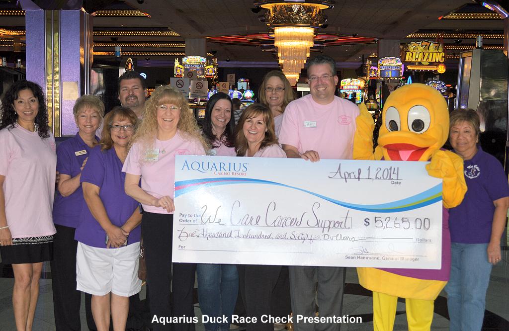 Aquarius team members collected a record breaking $5,265 in support of the recent fifth annual We Care Cancer Support Duck Race fundraiser held at Community Park in Bullhead City. Funds were raised two ways by either “adopting” ducks to float down the river donating $5 and wearing the “Casual for a Cause” T-shirt for the day. Overall, Aquarius team members raised $3,115 through duck sales and $2,150 through casual dress days.
