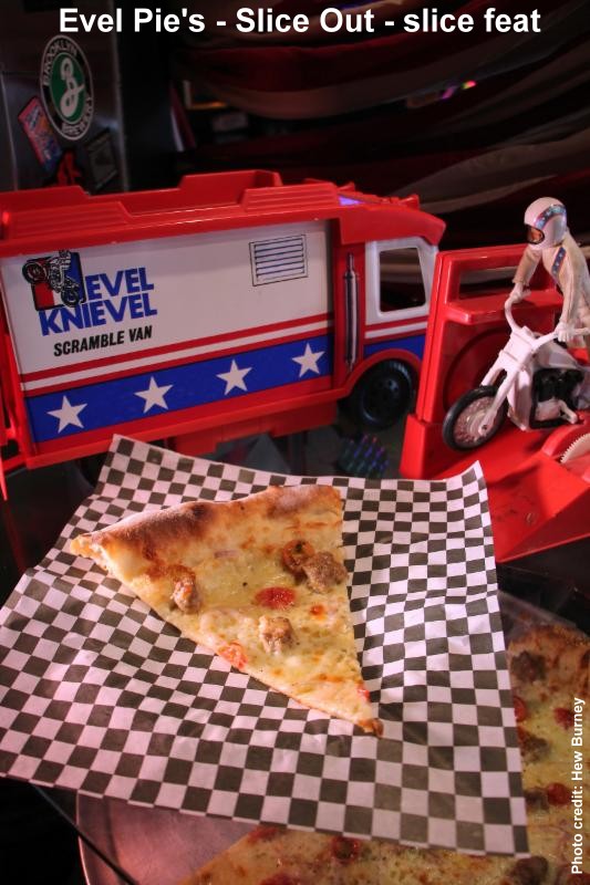 Evel Pie in Las Vegas is featuring their slice topped with fresh mozzarella, Fontina cheese, cherry tomatoes, sausage and red onion.