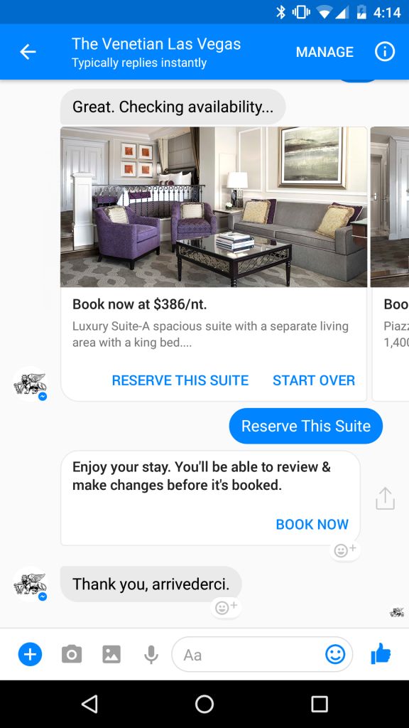 The Venetian launched one of the hospitality industry's first Facebook Messenger direct booking channels and the first for an individual hotel offering guests the opportunity to book directly and securely through social messaging.