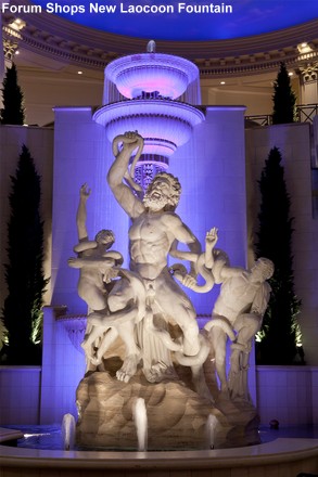 The Forum Shops recently debuted the new Laocoon Fountain and escalator making the transition from the level two to three visually-picturesque with a straight path at The Forum Shops at Caesars. The Laocoon Fountain, a 2,000 gallon waterfall cascading down 14 feet with three mushroom-style bubblers, leads to a custom replica of a famous ancient statue depicting Laocoon and his sons fending off a sea serpent.