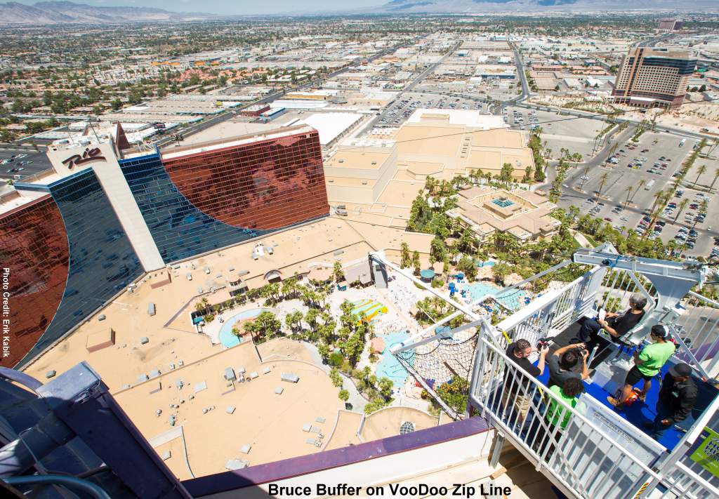 Mixed martial arts announcer Bruce Buffer hosted the launch of the VooDoo Zip Line at the Rio with his signature catchphrase, “It's time!” Created by New Capital Ventures, VooDoo Zip Line accommodates two riders at one time and connects the two towers of the Rio more than 490 feet above the ground. The feet-dangling, adrenaline rush attraction begins on the patio of VooDoo Steakhouse on the 50th floor of the Masquerade Tower and propels riders at speeds up to 33 miles per hour to the adjoining 20-story Ipanema Tower. Guests make a return trip to the starting point traveling backwards at 20 miles per hour. The heart-pumping adventure covers one-third of a mile in one minute and 10 seconds.