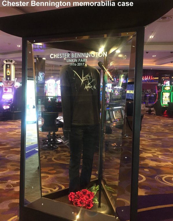 Chester Bennington, the American singer and songwriter best known as the frontman for the platinum-selling hard rock band Linkin Park, is being remembered at the Hard Rock Hotel & Casino with a special memorabilia case. He recently passed away in his home near Los Angeles at age 41. The case includes a Ve'cel by Chester Bennington shirt, which belonged to the singer and was gifted to Hard Rock from Bennington and the band. The shirt was noted as “stage worn.”