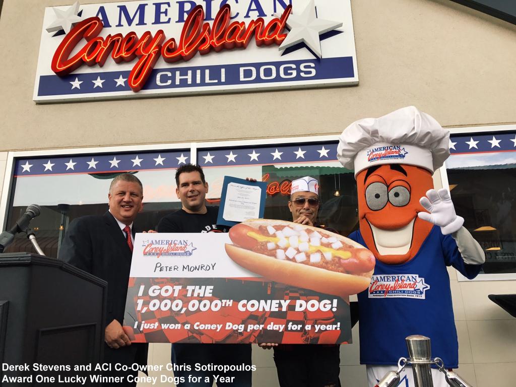 American Coney Island (ACI) at the D Las Vegas commemorated the landmark sale of its one-millionth Coney Dog on July 25. The lucky “wiener” was Las Vegas resident Peter Monroy, who will receive a year of free Coney Dogs. ACI the Detroit-originated company is currently celebrating 100 years in business. Attending the festivities were ACI co-owner Chris Sotiropoulos joined by the D's CEO Derek Stevens and ACI's mascot Coney D.