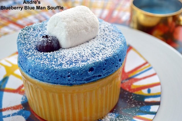 Through Aug. 31, Andre's Restaurant & Lounge at Monte Carlo is offering a new Blueberry Blue Man Soufflé inspired by the Blue Man Group appearing at the hotel. The colorful dessert is a blueberry soufflé topped with a fondant marshmallow, one carefully-placed blueberry, sprinkled powdered sugar, and “spin art” specially created for beneath the dessert.