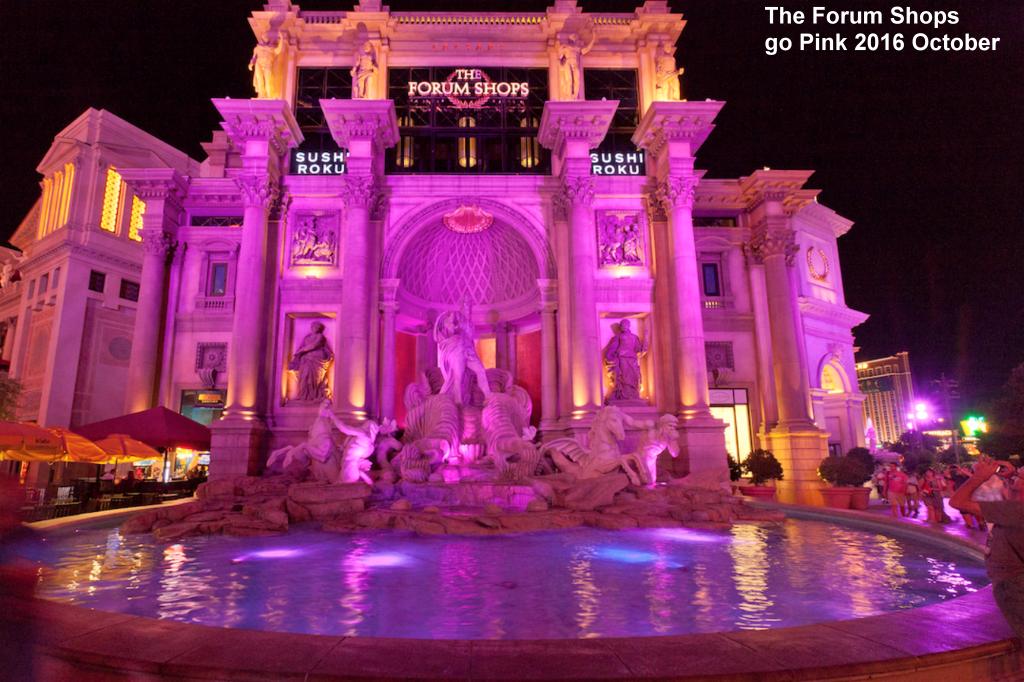 The Forum Shops at Caesars Palace exterior and Triton Fountain are bathed in pink all month while guest services reps wear pink scarves and ties and the pink ribbon symbol is projected on the ceiling near the Fountain of the Gods. Also some retailers are offering special pink products.