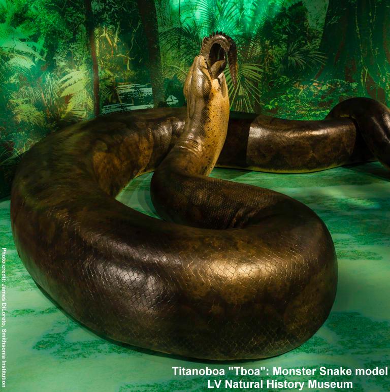 A realistic replica of the world's largest snake will be on exhibit at the Las Vegas Natural History Museum Oct. 14-Jan. 8. Slithering in at 48 feet long and an estimated one-and-a-half tons, “Titanoboa: Monster Snake” includes the snake replica and two vertebrae casts made from the original fossils: a 17-foot-long modern green anaconda and the vertebra from Titanoboa, as the giant snake is called. Videos produced by the Smithsonian Channel tell the story of this scientific discovery of the 60-million-year-old snake. “Titanoboa” will travel to 15 cities on a national tour organized by the Smithsonian Institution Traveling Exhibition Service.