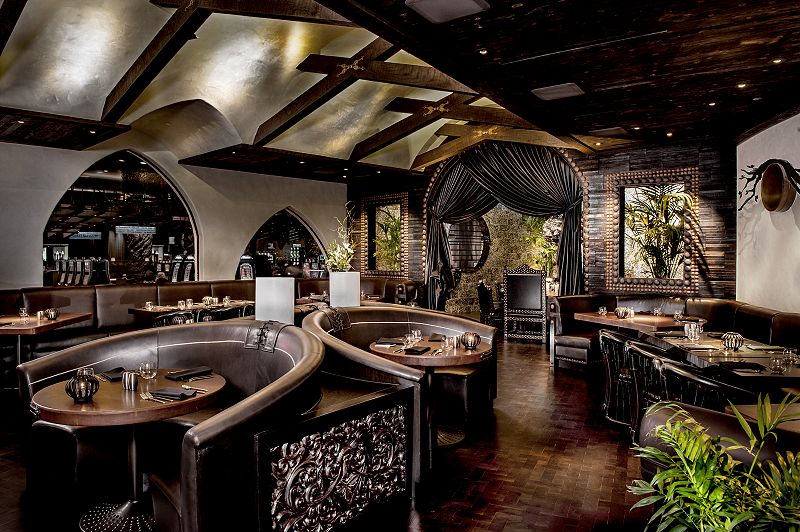 Javier's has a rich dramatic ambiance. A lounge is adorned in 4,000 metal decorative nail heads called “clavos” and accented by plush furnishings. Each culturally inspired decoration and piece of furniture was custom-made for the ARIA location, including reclaimed vintage belts adorning window and doorframes.