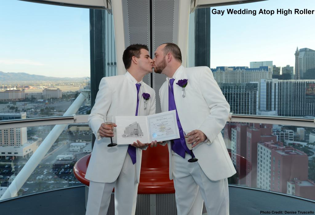 Caesars Entertainment properties in Las Vegas celebrated their first legal same-sex wedding performed at the Flamingo followed by a champagne toast on the High Roller observation wheel. All the wedding chapels at Caesars Entertainment owned and operated resorts in Las Vegas and the High Roller are offering 15 percent off same-sex renewals and ceremonies through March 1, 2015.