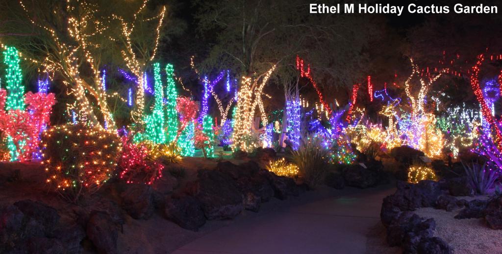 The Ethel M Holiday Cactus Garden will be open every evening through Jan. 1 with free admittance and the garden glowing nightly from 5-10 p.m.