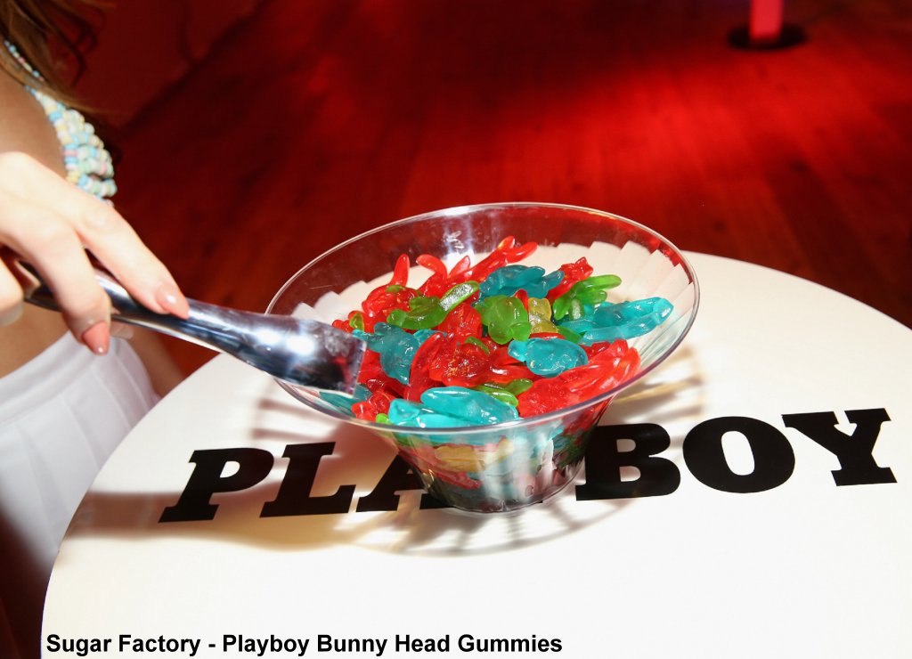 Sugar Factory has embarked upon a sweet new partnership with famed lifestyle brand, Playboy. Merchandise, such as Playboy Couture Pops, chocolate bars, packaged lollipops, bunny gummy bears, candy bras and candy pails, will be created with the signature Playboy Rabbit Head logo embedded on each item. Select pieces of the line were revealed at the iconic Playboy Mansion's annual Halloween bash. Sugary confections, created specifically for this one-of-a-kind collaboration, will be available for purchase at Sugar Factory retail locations and online and for wholesale purchases as well.