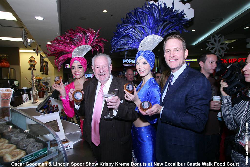 The Castle Walk Food Court at Excalibur held its grand opening with former mayor Oscar Goodman and dozens of Strip entertainers. The innovative new food court introduces the first Cinnabon, Hot Dog on a Stick, Popeyes Louisiana Kitchen, Pick Up Stix and Schlotzsky's to the Strip. The food area also features Krispy Kreme Doughnuts, Tropical Smoothie Café, Auntie Anne's and Popcornopolis. In addition, the area features face painting, spray tattoos, oversized high-definition televisions for watching sports, flat panel screens as menus, an area for lounging, and the Big Chill, serving beer and cocktails.