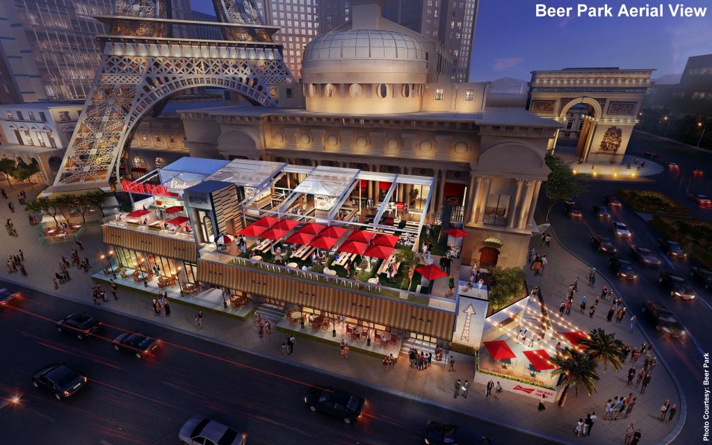 High top tables will line the rail overlooking the Strip, and a private VIP area will be available for parties and events. A rectangular bar is the centerpiece seating 80 guests. The dining room seats approximately 200 guests, and in total, the space accommodates up to 500 guests. Beer Park will be open daily from lunch through late night.