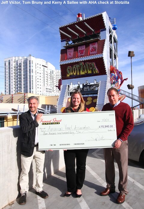 Fremont Street Experience donated 100 percent of SlotZilla revenue to the American Heart Association for everyone who flew on either the lower Zipline ($20) or upper Zoomline ($40) on Saturday, Nov. 8 from 10 a.m. to 5 p.m. President of Fremont Street Experience, Jeff Victor and Director of Marketing, Tom Bruny, presented Kerry A. Sallee, Business Development Director of the American Heart Association a check of $15,940.