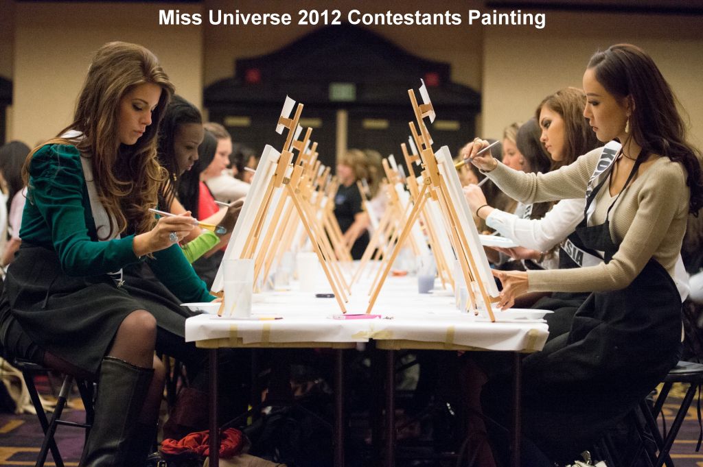 Eighty nine of the contestants who competed in this month's 2012 Miss Universe® Competition at Planet Hollywood completed a canvas work of art under the direction of Rachel Roberts, owner of Las Vegas-based Design & Wine Eat Drink Paint. Now all their artwork is available for sale in a worldwide auction running through Jan. 14, 2013. Proceeds will benefit Cure 4 The Kids Foundation. Each winning bidder will receive the signed artwork, along with a signed headshot of the Miss Universe contestant who created it. To bid, visit www.PaintLV.com